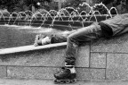 | Titolo e testo visivo vanno quasi d'accordo se non fosse per quel "meritato" che appare come un'aggiunta a posteriori senza un oggettivo riscontro visivo. Un riposo emblematico, di cui non possiamo conoscere l'individualità del soggetto e a cui dobbiamo dare un'interpretazione universale fine a se stessa. Un riposo urbano potremmo aggiungere, forse, di un giovane pattinatore. La tecnica che accompagna l'istantanea non soffre di particolari critiche mentre l'idea di fondo appare piuttosto debole. L'unico appunto che mi viene da proporre è il peso visivo di quegli zampilli di acqua nei settori posteriori che attraggono molta attenzione al soggetto principale per via della loro parziale sovrapposizione, dei lori toni chiarissimi, e del loro motivo ripetitivo, senza andare a produrre un valore aggiunto, dei nuovi significati. |