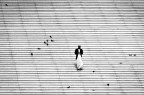 La figura perņ č centrale e comprime la dinamicitą della camminata e del senso vettoriale dato dalle linee oblique.