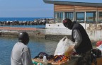 Titolo a parte, mi pare che la luce dura e il tutto a fuoco non ti abbiano aiutato. Nell'inquadratura ha più peso il molo e il locale sullo sfondo che non i due venditori, tagliati e ripresi da un'angolatura poco funzionale al racconto.
