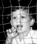 catturi uno sguardo intensissimo e intriso dell'euforia del gioco. bella l'idea di ritrarre il piccolo attraverso le maglie della rete. buon bn, giustamente contrastato. forse leggermente esagerata la lavorazione sulle sclere e sull'iride degli occhi  |