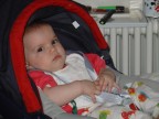 Non considerando il valore affettivo per la foto, mi permetto di far notare come gli elementi di sfondo, piuttosto visibili, possano creare disturbo al ritratto. A mio avviso sarebbe stato meglio un inquadratura con rotazione verso destra in modo tale da far uscire il testino dalla cupola del passeggino.