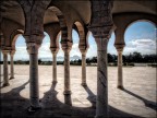 L'idea di osservare un paesaggio attraverso una 'quinta' architettonica o naturale è molto spesso vincente: in questo caso, a mio avviso, il numero di elementi che hai incluso nel fotogramma è troppo numeroso e, complice l'intervento anche delle ombre, non facilita la lettura dell'immagine, inchiodando l'occhio e l'attenzione al primo piano. Si nota molto rumore a livello del cielo e delle volte, forse per l'eccessiva apertura delle ombre in post.