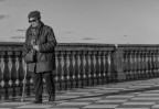 Il parapetto, di questo che parrebbe un ponte, presenta una bella luce radente, anche l'ombra lunga è carina. Tuttavia io avrei optato per una composizione inversa, sacrificando l'ombra: ovvero avrei collocato la Signora nella parte destra, lasciando spazio in corrispondenza della direzione del suo "senso di marcia". Il bn mi sembra dinamico, ma un pò grigio, specialmente nel cielo e sull'incarnato della Signora.