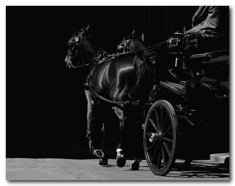 Urka, l'ho vista solo adesso. Difficilissima, io l'avrei sicuramente sovraesposta e avrei fatto un casino, ad esempio avrei bruciato la chiazza bianca sulla zampa del cavallo... o avrei fatto spot su un grigio medio, tipo la strada e sarebbe venuto tutto nero...