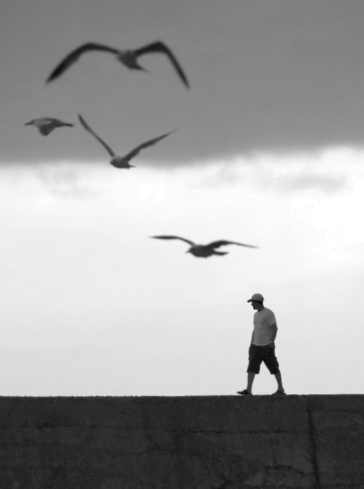Mi piace il contrasto di proporzioni tra gabbiani e uomo.