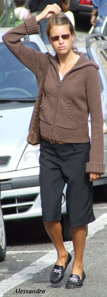 Beh, lei è senz'altro molto carina (a parte le scarpe... ma questo non c'entra ). Peccato davvero per quella mano sulla testa! Ma capisco che è uno scatto rubato... si vede dallo sguardo della modella che si sta chiedendo: "Ma che cavolo fa quello? Mi fotografa?"  |