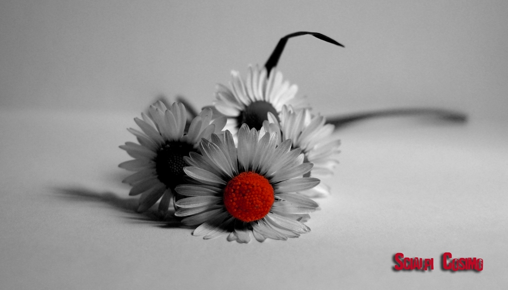 Bella la composizione, il bianco e nero e il cambiamento di colore alla margherita in primo piano. Non mi piace la firma all'interno della foto.