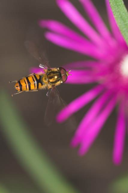 Molto carina, bella l'inquadratura dall'alto e il grosso fiore sfuocato bilancia molto bene il piccolo sirfide in volo, mi piace di più dell'altra.