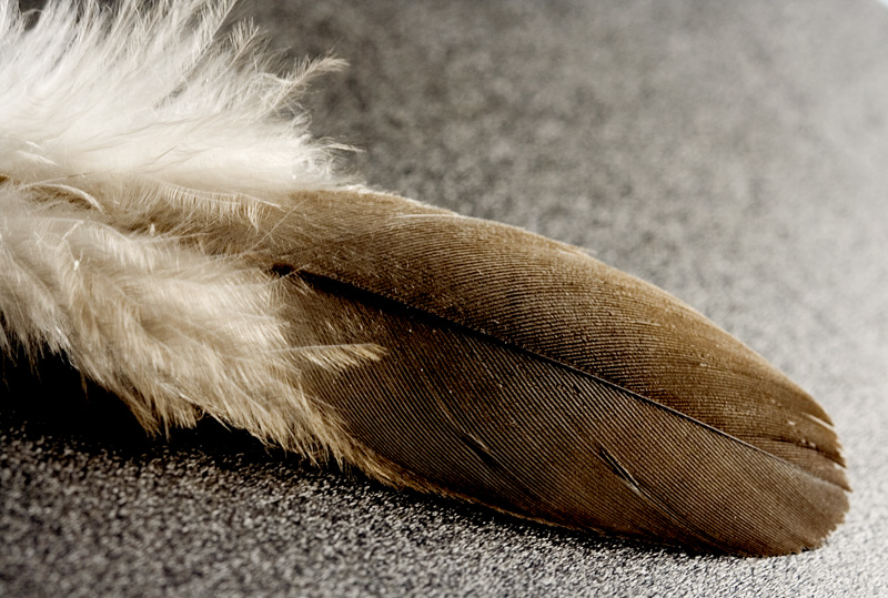 Sembra quasi un viraggio seppia oppure BN visto che non ci sono molti colori, avrei forse solamente lasciato un po' più spazio sopra nel senso che non avrei tagliato le piumine sopra e forse sarebbe stato non male vedere anche la parte a sinistra dove finisce la piuma ... IMHO