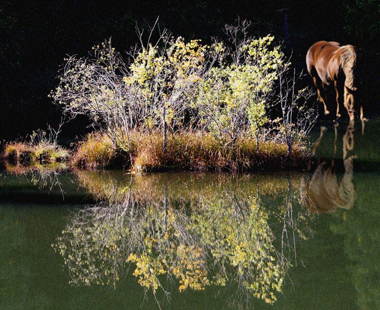 all'inizio la linea d'ombra mi aveva dato l'impressione trattarsi del ciglio di un laghetto, così mi sembrava che il riflesso del cavallo uscisse dall'acqua... questo rendeva l'immagine molto onirica anke con la figura del cavallo fuori fuoco.