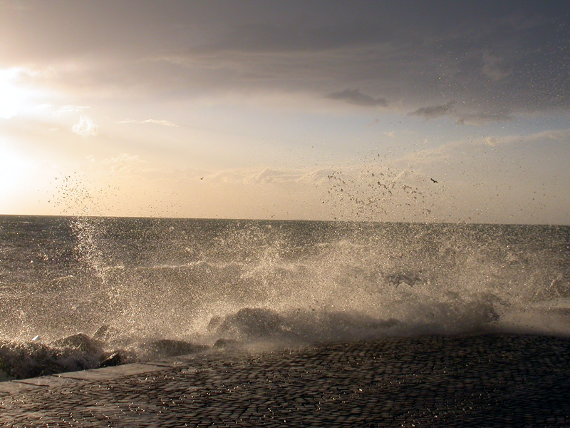 Il selciato in primo piano crea un ponte visivo con il mare e i suoi umori, ma rimane fine a se stesso; magari la presenza di una persona (ad es. un pescatore), o di un animale (so che con quelle sbuffate d'acqua a niente e a nessuno vien voglia di sostare in un punto del genere), o di un oggetto abbandonato avrebbero potuto arricchiere la storia!