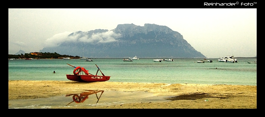 Compositivamente abbiamo diversi elementi che contrastano tra loro: il monte in centro che disegna una figura chiusa e rende molto "stabile" l'immagine, le barche nel piano intermedio volte tutte in una direzione che guidano l'occhio a sinistra e il pattino (già attraenete per il colore) che ci rinvia a destra....