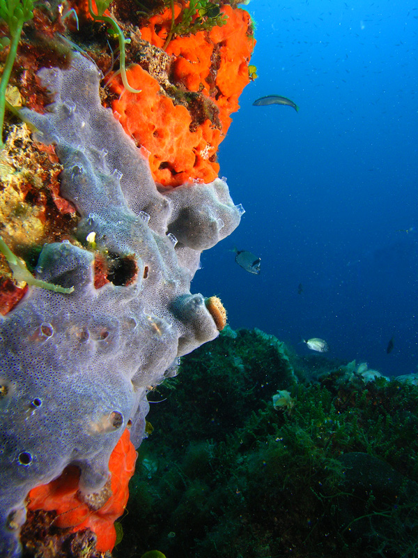 Parete incrostata da spugne e da altri organismi.