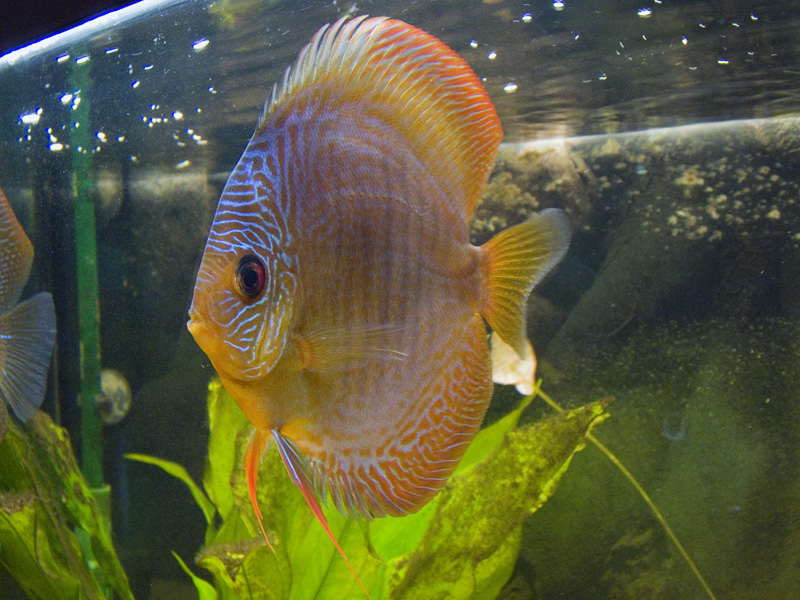ti posso iautare con un paio di suggerimenti. per come è la foto non è tanto riuscita, l'angolo è troppo e si genera un riflesso che evidenzia il vetro, quindi la prossima volta foto frontale al pesce.Secondo, sei stato troppo basso, e puntando verso il pesce, hai inquadrato il filo dell'acqua che genera disturbo, quindi, macchina o parallela o sopra la linea del soggetto.Ultimo più luce così riesci a gestirti i colori e la nitidezza.