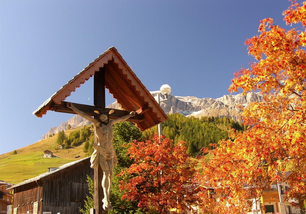 Foto scattata al di fuori di una bella chiesetta in stile alpino ad Arabba sulle Dolomiti.