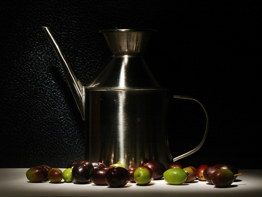 Simpatica composizione... avrei preferito una luce più forte ma localizzata solo sulla base, per dare maggior risalto alle olive...