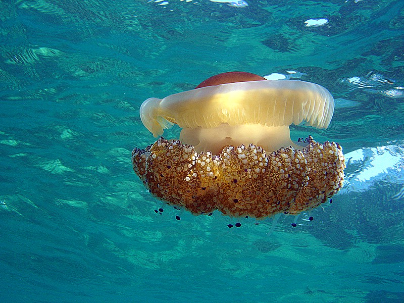 Medusa cassiopea che fluttua nella corrente; questa specie, al contrario della Pelagia, raggiunge grandi dimensioni (come un pallone da pallavolo) e non è pericolosa.