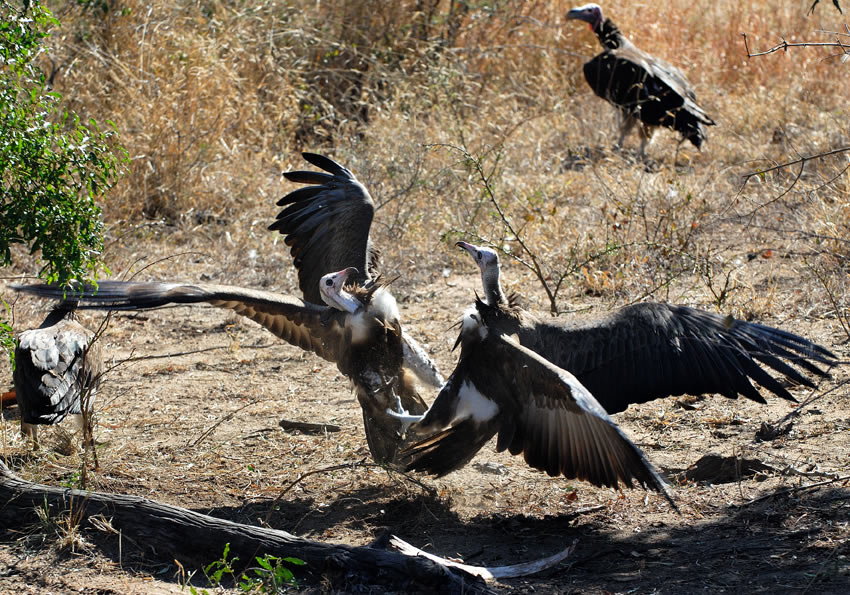 Nella prima foto si vede un Avvoltoio orecchiuto (Torgos tracheliotus) sullo sfondo e due Avvoltoi cappuccini (Necrosyrtes monachus). Nella seconda foto un Avvoltoio cappuccino (Necrosyrtes monachus). Nelle altre foto dovrebbe trattarsi di Grifoni dorsobianco africani (Gyps africanus). Tutte queste specie sono ampiamente diffuse nell’Africa sub-sahariana.