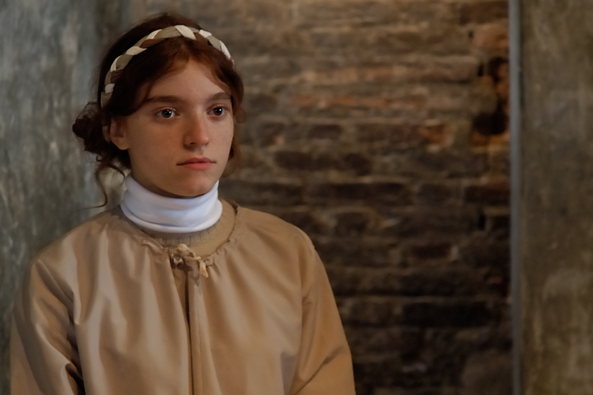 festa medievale? la ragazza ha un viso molto...molto..non so, l'ho fissata a lungo, sembra anche lei a tema, nonostante si tratti di un travestimento, di una finzione. lo sfondo a tema, lei assolutamente rilassata e non attenta alla posa, i colori..a me piace molto Wink
