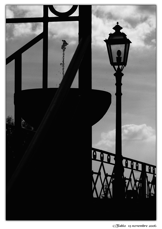 La presenza del nero mi sembra eccessiva, invadente: è tutto molto scuro, e probabilmente il gioco di controluce potrebbe essere più equilibrato eliminando tutta la parte in basso, ringhiera compresa. Bella la ricerca dell'intreccio in alto e il parallelismo fra lampione e getto d'acqua .