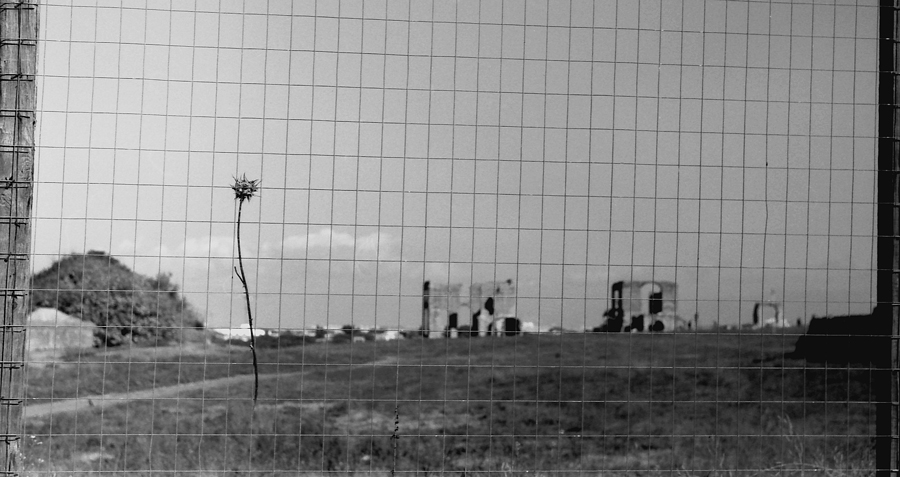 quando ho visto lo scatto mi è venuto in mente un aziano (il fiore secco) imprigionato nelle maglie del presente (la rete), che malinconicamente guarda ad un glorioso (per lui) passato (le rovine romane).