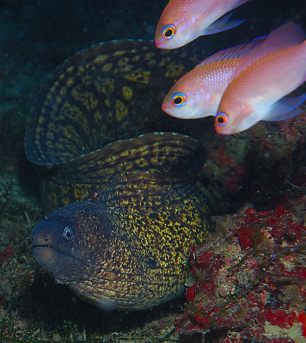 Sinuosa murena osservata in modo incuriosito dalle monache rosse. Nonostante siano un pò fuori fuoco, volutamente, ho deciso di metterle nell'inquadratura, giocando con l'intersezione delle linee della sezione aurea: