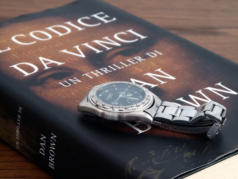 La copertina del libro ed il vetro dell'orologio hanno preso una luce di taglio che sbiadisce un pò tutto.