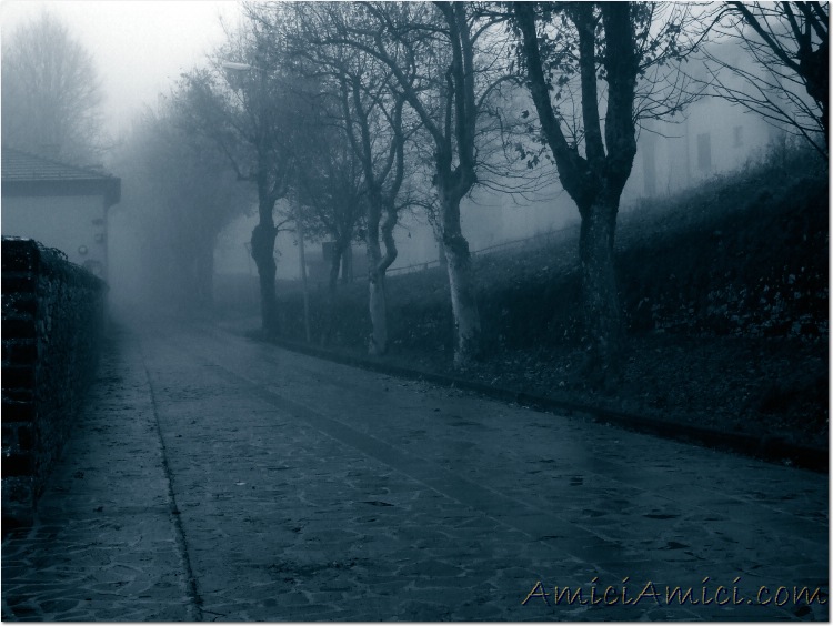 | una foto dall'atmosfera particolarmente tetra, grazie alla nebbia presenta e penso anche grazie al viraggio usato |