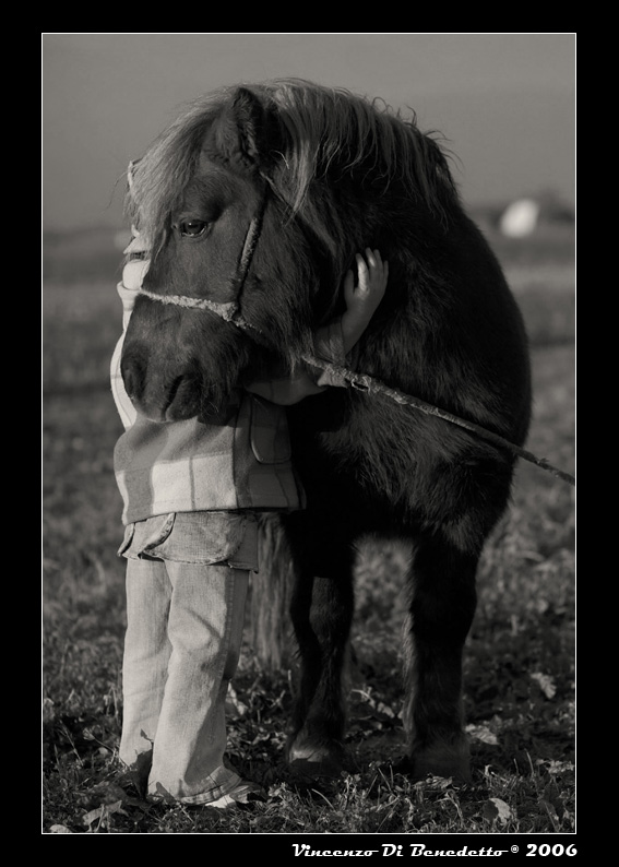 Boh...mi fa quasi respirare gli odori di quel prato, l'associo tantissimo al musone tenero del cavallo, e pure il cappottino ci sta, perché a mio avviso evidenzia l'ingenuità e il tono fanciullesco di questo abbraccio di bimba che, fuori da tutte le pose e le foto studiate, é un momento di autenticità assolutamente insuperabile...