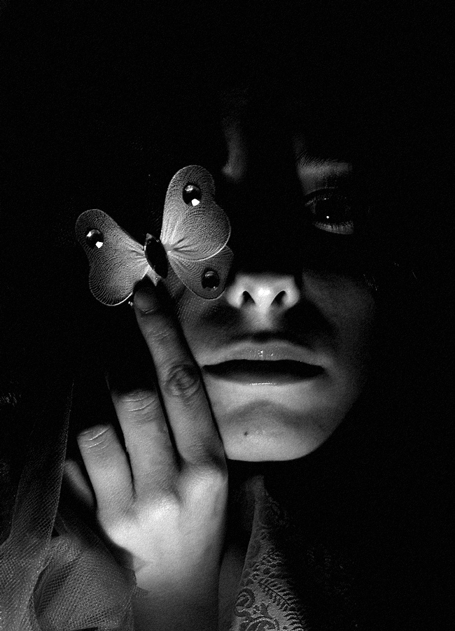 Ciao dea molto interessante l'idea se posso dare il mio parere riproverei lo scatto tenendo la farfalla in modo piu' simmetrico e libererei dall'indice il ....mmh..... come dire il ''bottone'' basso a dx.Ancora proverei a mettere 1 dei due ''diamanti'' o sono rubini? LOL all'altezza della pupilla del'okkio dx,cosi' e' appena appena piu' alto del dovuto.Bella la luce sul viso dal basso.Naturalmente col senno del poi siamo tutti piu' bravi.....Davide