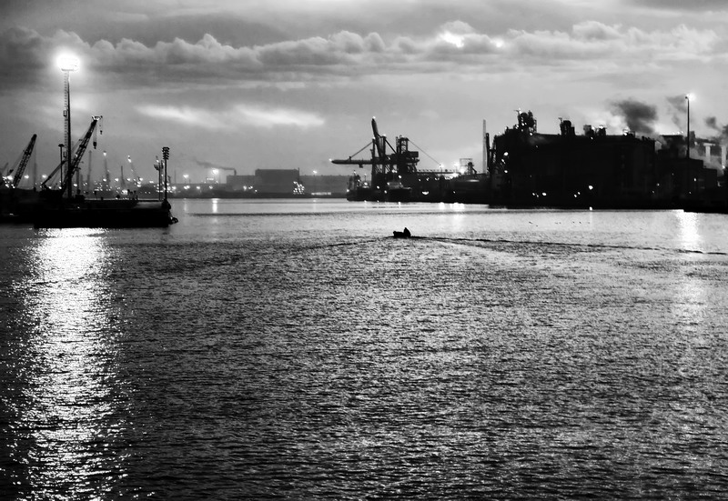 Quella barchetta fa pensare, così sola nel bel mezzo di questo scenario industrial-portuale... Mi trasmette la sensazione di un gesto ostinatamente antico, quasi un rivendicare il diritto di esistere e di sopravvivere di ritmi e attività antichi nel bel mezzo di un ambiente trasformato e quasi ostile.