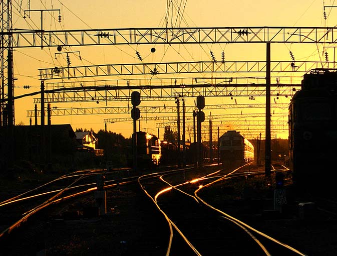 Bella la contrapposizione tra il caldo del tramonto e la ferraglia dei binari.