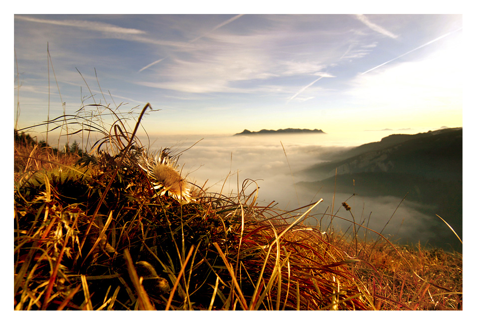 L'accostamento dei toni caldi del primo piano e freddi dello sfondo e' un elemento del successo 'cromatico' di questa fotografia. La composizione, pero' risulta penalizzata dal primo piano confuso, senza un un punto forte di interesse (che poteva essere il fiore, se non fosse 'disturbato' eccessivamente dal groviglio dell'erba). Questo aspetto diventa piu' evidente se si prova ad osservare la foto sesaturata, cosi' da non farsi distrarre dall'accattivante cromatismo.
