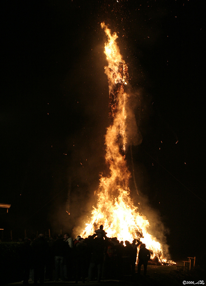 dalle mie parti...in Sardegna, il falò lo facciamo per il giorno di Sant'Antonio e di San Sebastiano. Però non con le cose vecchie ma con grandi frasche di pino e rosmarino. In cima si mettono le arance ed i ragazzini salgono quando il fuoco è acceso per lanciarle al pubblico..