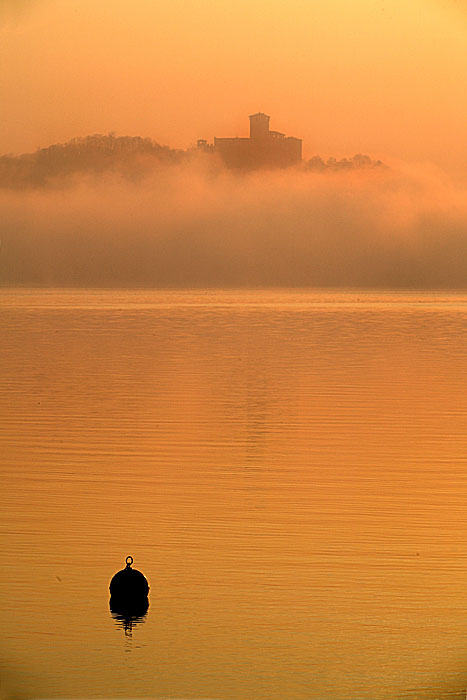 Primo mattino, luce incidente da sud-est, nubi basse, ed equilibrio di masse tra la piccola boa nettamente in primo piano e la rocca sullo sfondo indefinito; ma a cosa si devono i due riflessi verticali nell'acqua presenti al centro della foto?