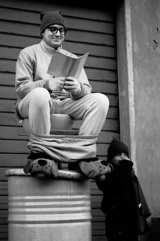 beh è un modo di inserire un mimo all' interno di una street senza banalizzarla... situazione che da contrasto al bn per prima cosa (Mimo argenteo e bimbo nero nero ) e poi c'è la spontaneità del ragazzino!!