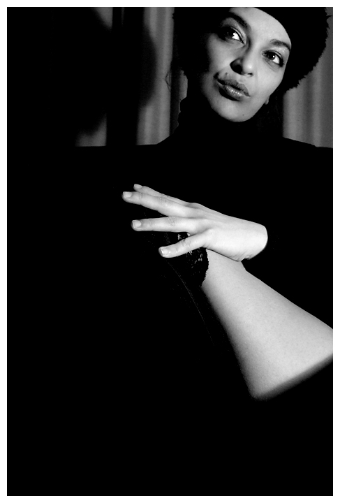 devi però, secondo il mio modesto ma fermo parere, recuperare la mano. è molto importante nell'economia complessiva della foto. le bruciature non ci stanno bene, ed è troppo sovraesposta nei medi in rapporto al bilanciamento dell'immagine. la vedrei poco (poco) più chiara del viso, e più scura di quel trapezio (cosa cappero è, a proposito?).