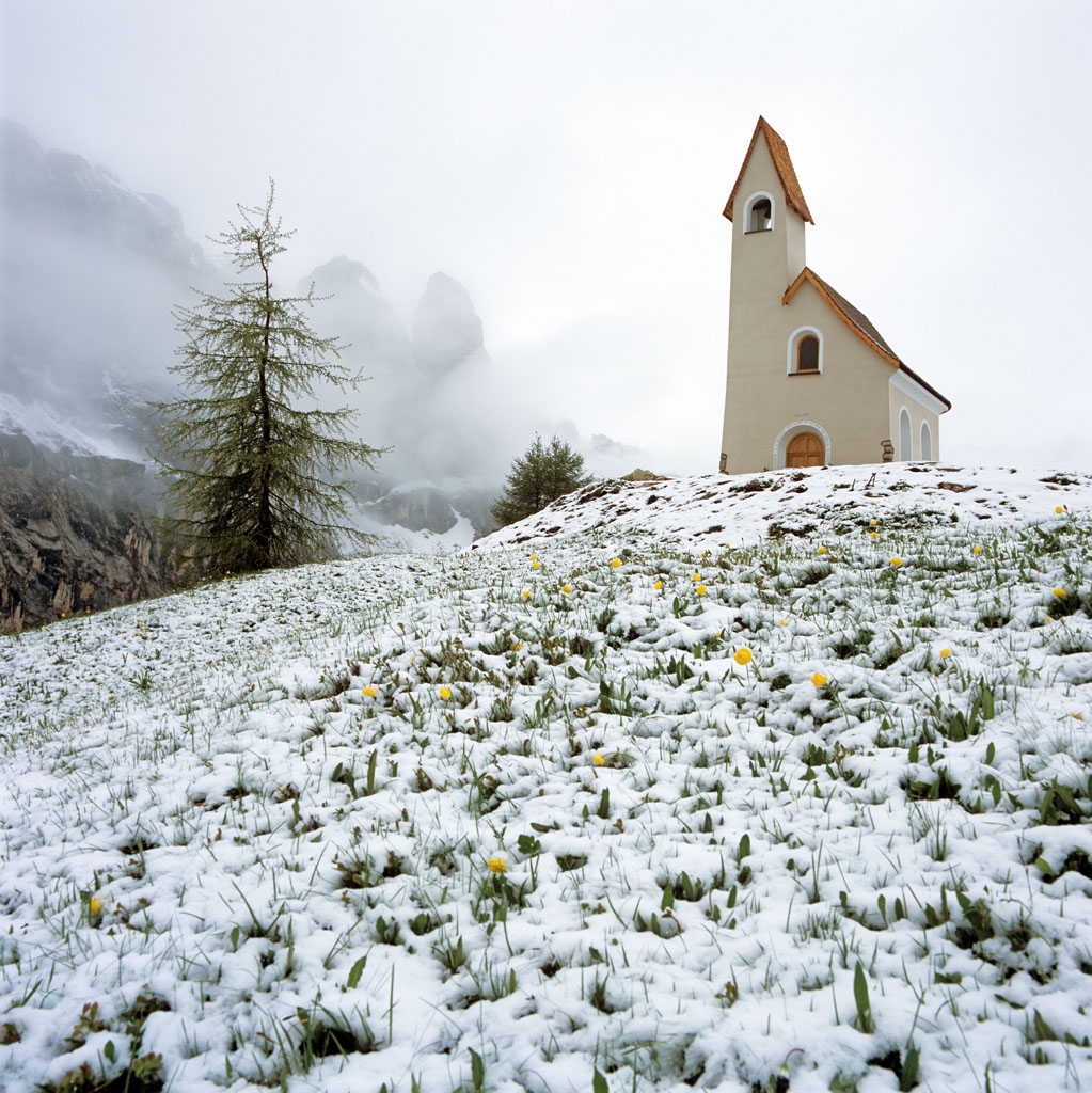 fine giugno, nevica di brutto, tutto nella nebbia, un vento teso improvviso squarcia il cielo per pochi secondi e dona un raggio di sole proprio sulla chiesetta. Non ho fatto in tempo a cogliere il raggio di sole ma l'atmosfera incantata mi pare sia rimasta.