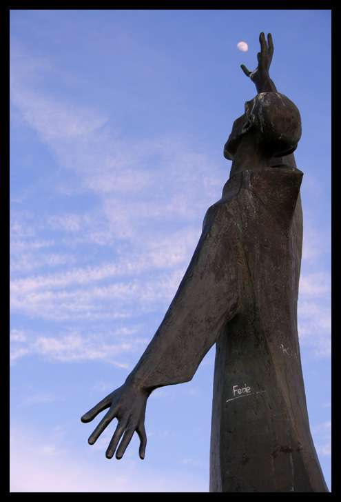 Mi piace molto il colore del cielo che contrasta con la statua e la luna, quella della luna è un'idea magnifica..bello anche il taglio..