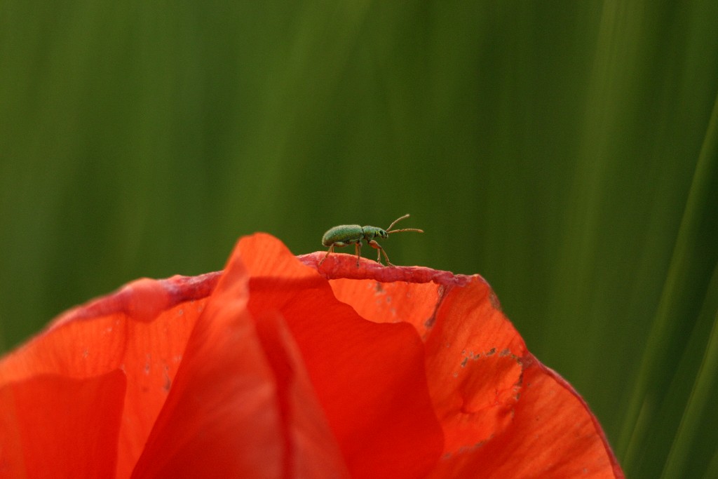 Secondo me è una macro molto buona. Forse, data la posizione centrale del soggetto avrei tagliato un pò la parte bassa e un pò a sx. Anche se significa sacrificare il bel rosso del papavero, ne guadagnerebbe il magnifico sfondo. Un filo di precisione in più di maf sulla bestiola poi non avrebbe certo guastato.