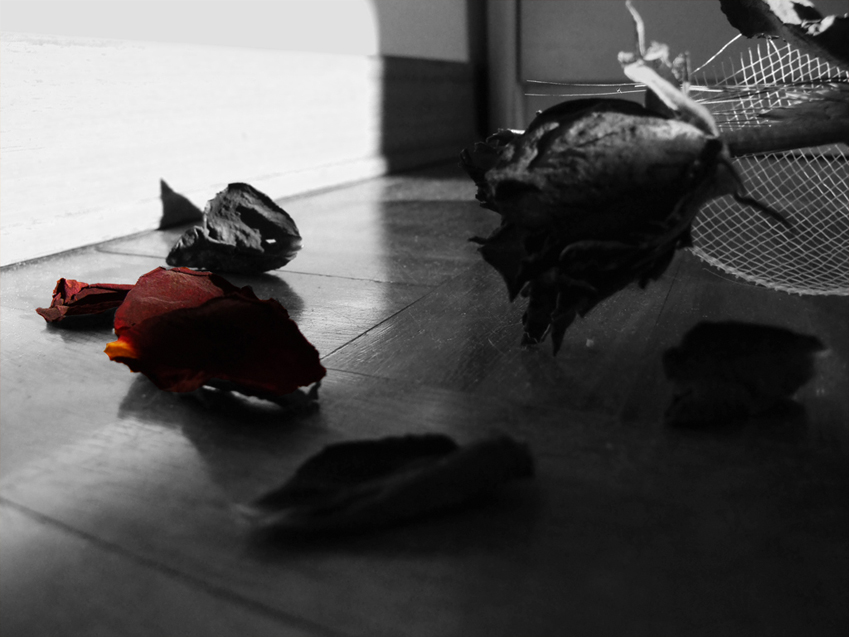 Ripresa dal basso, porta socchiusa sullo sfondo,sfocata,la rosa nella stessa posizione presentata in questo fotogramma con alcuni petali staccati,la rosa ovviamente appassita,una debole luce deve filtrare dalla porta,una luce smorta ma uniforme...prova.