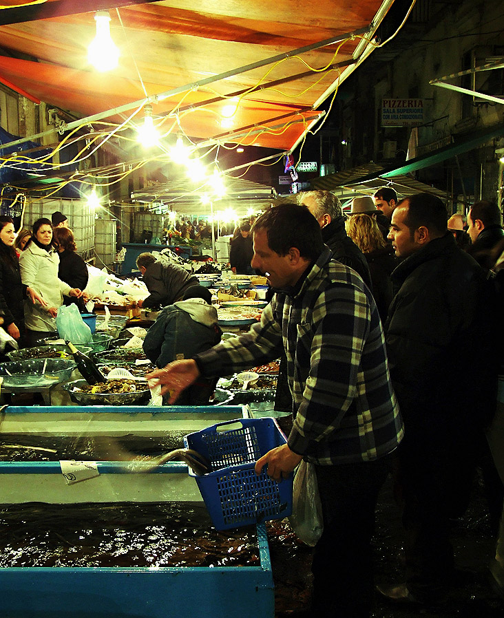 | Da qui si vede che Napoli e Palermo si somigliano! Molto carina la situazione il senso di movimento e confusione che ci vuole, gli spruzzi d'acqua, sembra di sentire l'odore, e la disposizione delle luci nello scatto. Forse il cross processing toglie all'immagine quella dominante calda caratteristica del mercato. |