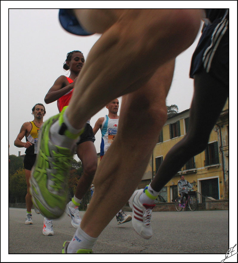 | bellissimo il punto di ripresa. mi piace il movimento delle gambe in primo piano, con quel piede che guida verso l'unico corridore a occhi chiusi per la stanchezza. Anche se è estraneo alla corsa, molto simpatico l'uomo in bicicletta a destra!!!!! |