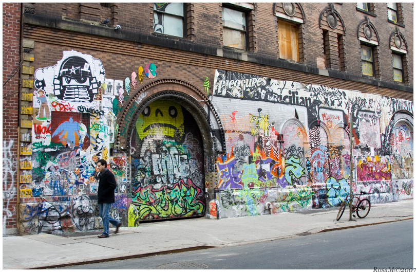 L'amtosfera della grande metropoli è stata catturata sapientemente grazie alla scelta del soggetto; il fotogramma è stato monopolizzato dalla lunga parete di graffiti, talmente fitta che con molta difficoltà si poteva cercare di riproporre il tema classico della street basato sull'interazione tra uomo e manifesti/murales. Apprezzabile l'aver inserito sia l'uomo che la bicicletta poggiata all'albero nella composizione, nell'ottica di ottenere un fotogramma bilanciato e buona anche l'ampia inquadratura. Per quanto riguarda il taglio si poteva anche valutare una semplice inquadratura frontale della parete. I colori ci stanno benissimo.