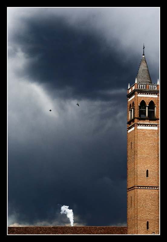 L' interesse della foto è basato sul fumo bianco con cornice della chiesa, contrastato dalla nuvola nera di sfondo. Ciao.  |