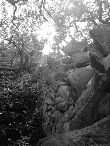 La scelta del b/n per ritrarre gli ulivi è a suo modo coraggiosa. Le pietre così in primo piano, che occupano quasì metà fotogramma non mi convincono molto anche se l'idea di utilizzarle da contrapporre ai filari di alberi secondo me è giustissima.