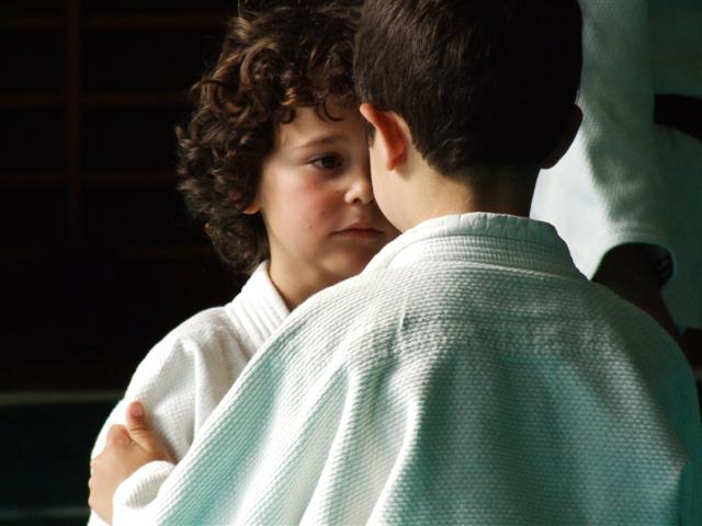 Mi piace molto il fatto che i due bimbi in attesa dell'hajime si guardino negli occhi, e questo momento catturato è il punto forte della foto. Anche i colori mi piacciono, mentre avrei scattato leggermente più dal basso in modo che i duo visi fossero alla stessa altezza e magari non avrei tagliato la testa del bimbo.