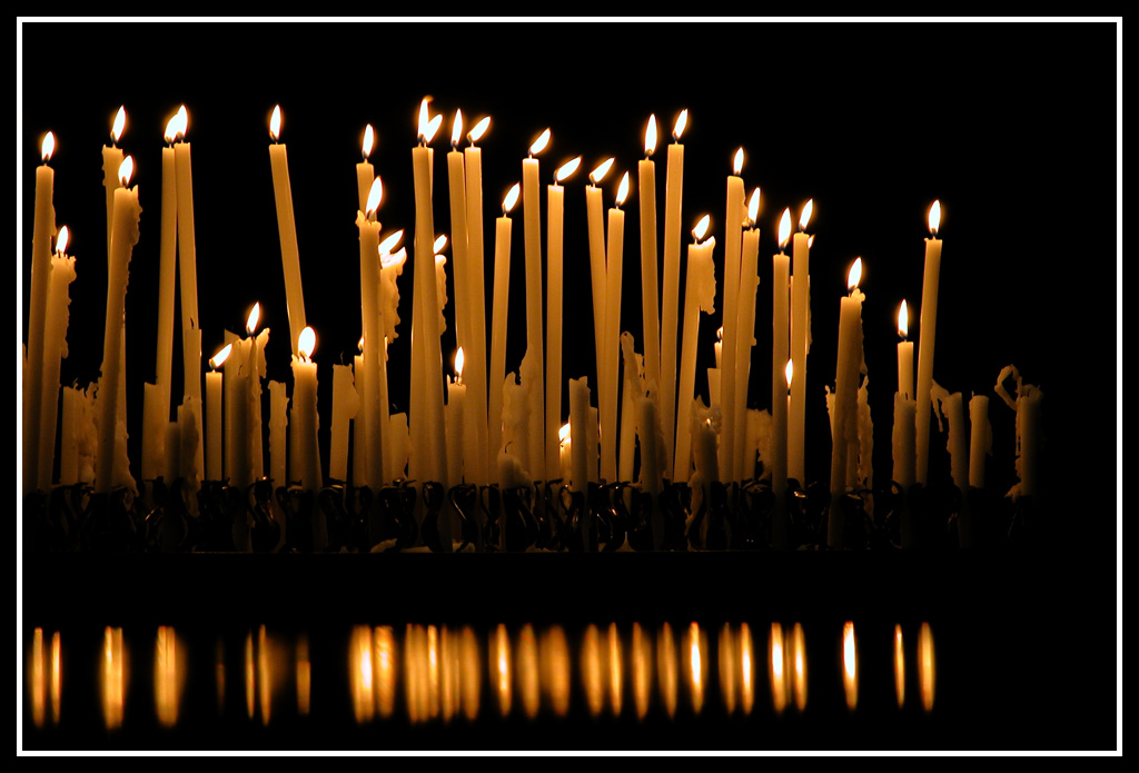I riflessi sono naturali: davanti alle candele vi era un'assicella di legno lucido orizzontale, quella dove le persone appoggiano i gomiti quando pregano.