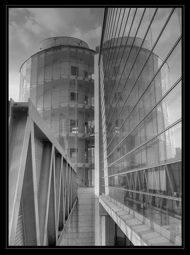 Ottima composizione, giocata su un uso sapiente della simmetria e del riflesso nel vetro, ma il b/n non mi convince in quanto troppo grigio, non contrastato. |