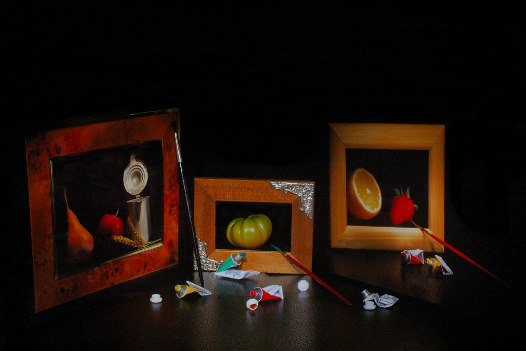 Un bel riassunto degli scatti precedenti. Mi colpisce l'aria giocosa e gioiosa di questo e dei pregressi scatti, nonostante lo sfondo nero e le luci non alte:questa atmosfera scherzosa, ironica rende vivo uno still-life antiretorico e sorridente.